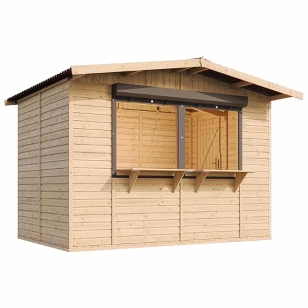 TIMBELA Abri de Jardin en Bois M150B – Kiosque Bois - Stand Marché avec 5 Fenêtres, L336xP263xH232 cm / 6 m², Facile à Monter et à Démonter, Bar JardinSTAND DE VENTE POP-UP. Facile à monter et à démonter pour les marchés, foires et festivals. Comprend une trappe de fenêtre verrouillable, qui sert de comptoir, présentoir et espace de service. La cabane en bois mobile parfaite pour les événements. BAR EN BOIS POUR JARDIN. Si vous avez toujours rêvé d'avoir votre propre bar extérieur en bois, cette maison Timbela vous offre la solution ! Installez quelques meubles de jardin en bois et dégustez vos boissons préférées entre amis ou en famille ! ABRI DE JARDIN EN BOIS SHIPLAP DE QUALITÉ. Le revêtement mural épais et durable en shiplap de 17 mm et les bois de pin et d'épicéa certifiés FSC de l'U.E. offrent un stand de vendeur en bois de haute qualité. Ce style de construction permet de placer le panneau de porte à l'endroit de votre choix pour faciliter l'accès à votre kiosque en bois. CHALET EN BOIS ADAPTÉ À TOUTES LES SAISONS ET À TOUTES LES OCCASIONS. Profitez de la protection contre les éléments grâce au toit en tôle ondulée bitumineuse qui protège du soleil et de la plui. Notre maison en bois est idéal pour les divertissements extérieurs. DES STANDS DE VENTE EN BOIS DIGNES DE CONFIANCE. Avec 30 ans d'expérience, personne ne connaît mieux que nous les chalets de jardin en bois. Nos cabanons de vente sont conçus pour durer et bénéficient d'une garantie fabricant de 2 ans.